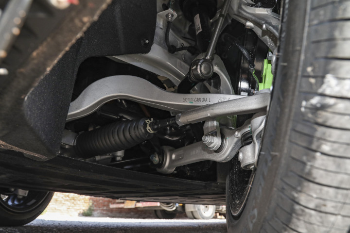 对于零跑C11的地盘来说,它的结构采用的是前双叉臂、后多连杆式独立悬架组合,配备双 FSD 减震系统,基础的结构搭配能够为车辆带来稳定且扎实的驾驶体验感受,而双 FSD 减震系统则能够更好的过滤掉多余的振动,带来更加舒适且稳定的驾驶感受。